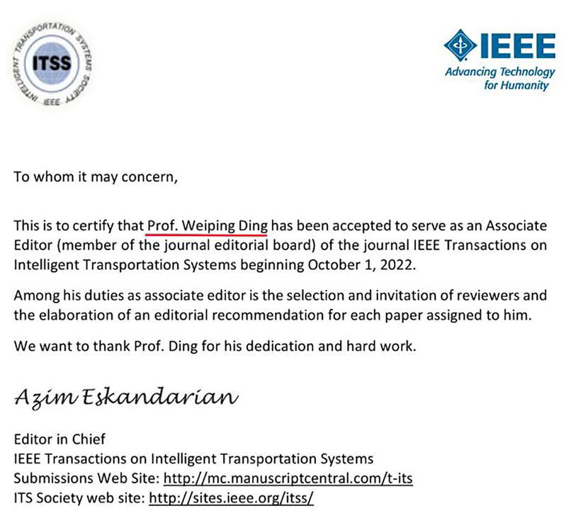 我校丁卫平教授应邀担任《IEEE智能交通系统汇刊》副主编。