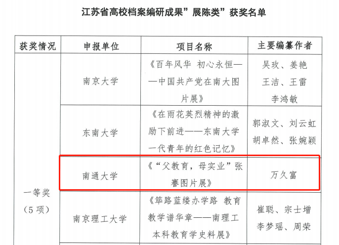 我校获“江苏省高校档案编研成果(展陈类)”一等奖。