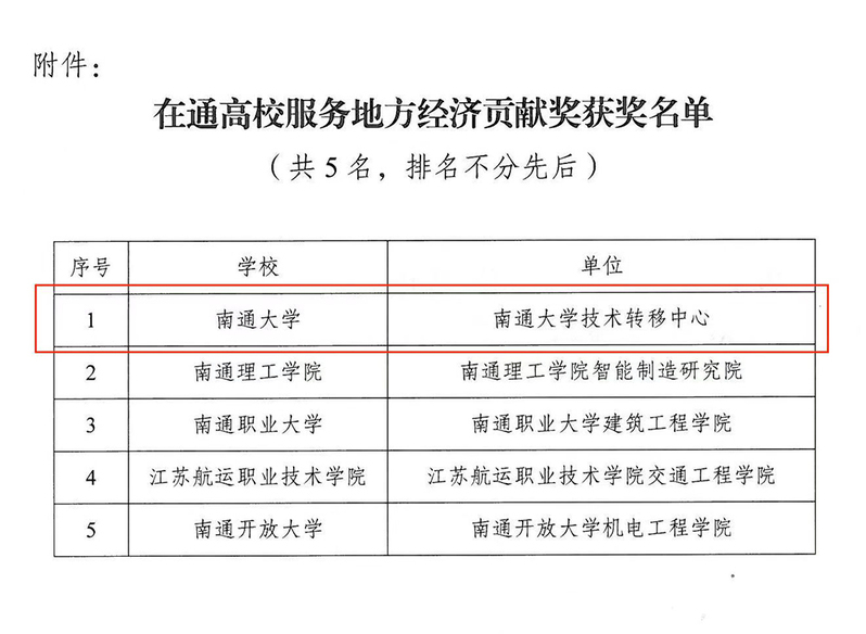 近日,南通市教育局公示了“在通高校服务地方经济贡献奖”评选结果,我校技术转移中心喜获殊荣。