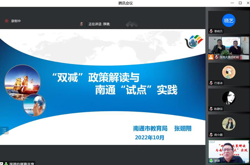 张翊翔从“双减”政策的背景意义、“双减”工作一年调研报告、南通实践三个方面对“双减”进行了介绍,明确了南通作为试点城市主要在党政推动、学校能动、规范驱动下对于“双减”工作的开展关系全局成效。