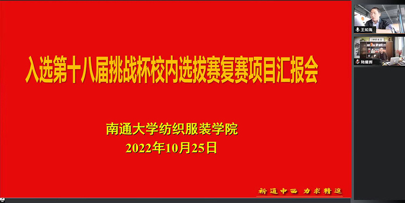 10月25日下午,纺织服装学院举办“挑战杯”项目汇报会,并邀请到中国青年创业导师团成员,中国青年创业奖、创青春全国总决赛评委,上海允格众创空间管理有限公司董事长陆耀辉线上指导。