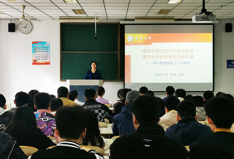 蔡娟以《描绘中国式现代化宏伟蓝图,谱写中华民族伟大复兴光辉乐章》为题,从牢牢把握过去5年工作和新时代十年伟大变革的重大意义、牢牢把握习近平新时代中国特色社会主义思想的世界观和方法论、牢牢把握以中国式现代化推进中华民族伟大复兴的使命任务、牢牢把握以伟大的自我革命引领伟大社会革命的重要要求、牢牢把握团结奋斗的时代要求等五个方面,对党的二十大报告进行了系统全面的讲解。蔡娟希望同学们深刻领会新时代十年的伟大变革,深刻感悟作为新时代大学生在全面建设社会主义现代化国家、全面推进中华民族伟大复兴新征程中的责任和担当,以实际行动践行习近平总书记对青年的殷切嘱托,当好党的二十大精神的学习者、宣传者,坚定不移听党话、跟党走,立志做有理想、敢担当、能吃苦、肯奋斗的新时代好青年。