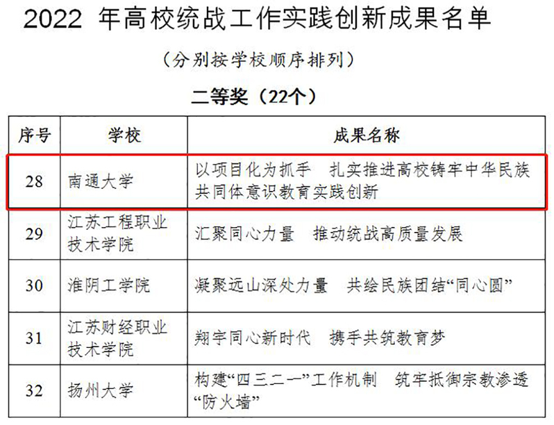 11月7日,江苏省委教育工委公布了2022年高校统战工作实践创新成果遴选结果,我校申报的案例荣获成果实践创新二等奖。