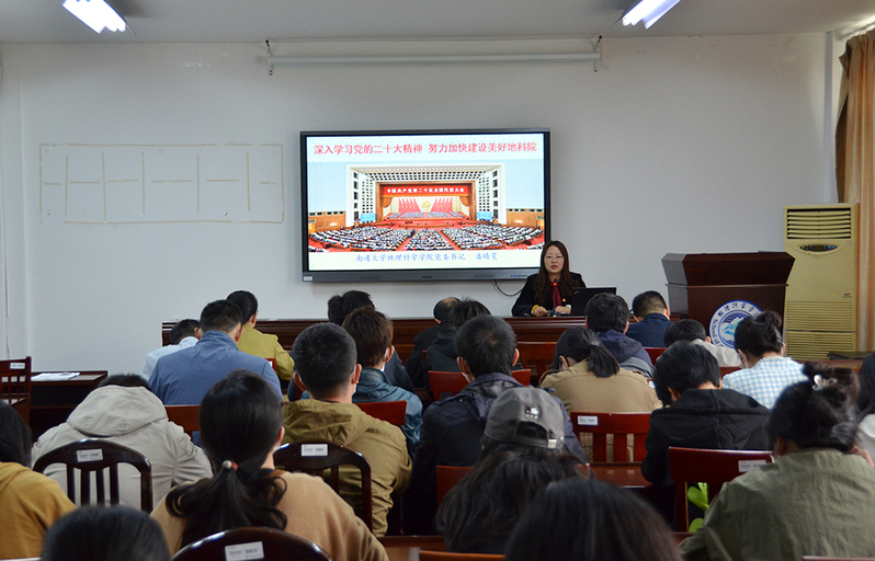 学院党委书记潘晴雯做了题为《深入学习党的二十大精神 努力加快建设美好地科院》的辅导报告,介绍了党的二十大基本情况,着重就二十大报告的15个主体内容做了深入解读。潘晴雯要求,全院上下要充分认识党的二十大的重大意义,把学习好、宣传好、贯彻好党的二十大精神作为当前和今后一个时期的首要政治任务。要通过学习,牢牢把握过去5年工作和新时代10年伟大变革的重大意义, 牢牢把握习近平新时代中国特色社会主义思想的世界观和方法论,牢牢把握以中国式现代化推进中华民族伟大复兴的使命任务,牢牢把握以伟大自我革命引领伟大社会革命的重要要求,牢牢把握团结奋斗的时代要求。要通过学习,深刻领悟“两个确立”的决定性意义,增强“四个意识”、坚定“四个自信”、做到“两个维护”,始终在思想上政治上行动上同以习近平同志为核心的党中央保持高度一致,确保各项工作沿着党的二十大指引的方向坚定前行。要把学习成果体现到政治能力的提高上,体现到主观世界的改造上,体现到工作水平的提升上,深刻把握党的二十大的重要思想、重要观点、重大战略、重大举措,在学习宣传贯彻中深入领会党的创新理论的道理学理哲理,学思悟践习近平新时代中国特色社会主义思想这一解答中国之问、世界之问、人民之问、时代之问的“金钥匙”,将全院师生员工的思想和行动统一到党的二十大精神上来,凝聚到党的二十大确立的目标任务上来,把学习宣传贯彻党的二十大精神与深入学习领会习近平总书记关于教育的重要论述结合起来,与落实立德树人根本任务结合起来,以更加务实有效的工作推动党的二十大精神在学院落地生根、开花结果,以昂扬奋斗的工作姿态、卓有成效的工作实绩为建设特色鲜明的高水平大学多做贡献。