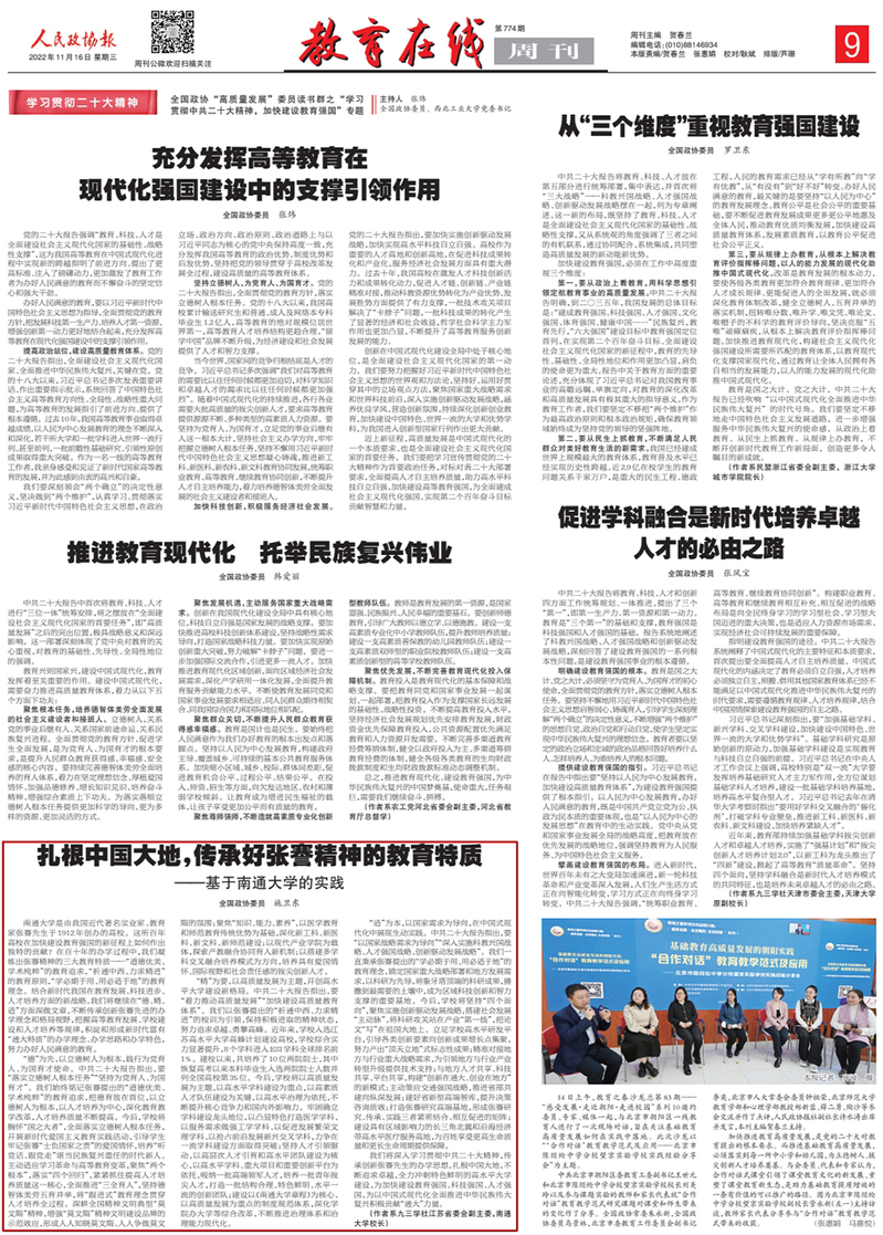 11月16日,《人民政协报》刊登全国政协高质量发展委员读书群之学习贯彻中共二十大精神,加快建设教育强国专题讨论,全国政协委员、九三学社江苏省委会副主委、我校校长施卫东以《扎根中国大地,传承好张謇精神的教育特质》为题,积极建言献策。