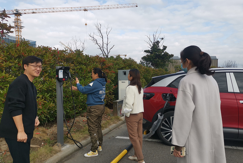 我校教职工在体验智能电动汽车充电桩充电服务。