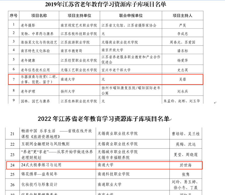 近日,省教育厅公布2019年和2022年省社区教育特色品牌和老年教育学习资源库子库项目认定结果,我校吴蓉老师主持的《乐器演奏与欣赏(二胡、古筝、琵琶、笛子)》、於世海老师主持的《24式太极拳练习与运用》两个项目分别入选2019年和2022年江苏省老年教育学习资源库子库项目。这是我校非学历教育精品教学资源首次入选老年教育项目。
