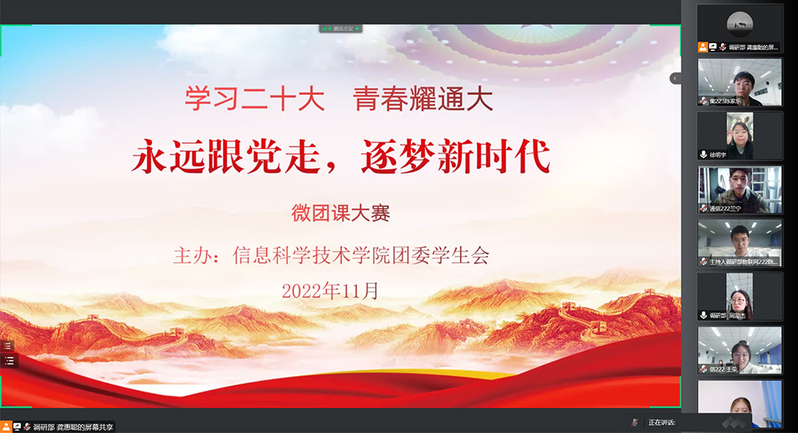11月29日,为了深入学习贯彻党的二十大精神,信息科学技术学院举办“学习二十大 青春耀通大——永远跟党走 筑梦新时代”微团课大赛。经过角逐,通信222班兰宁获一等奖,物联网222班陈浩雨、通信212吴铖䶮获二等奖,计科222班吴天宇、大数据222王瑞瑞、物联网223张竞丹、软工222韩文杰、集成222徐佳凝、电科221殷皓天、信223鲍政宇、大数据212黄蕾获三等奖。