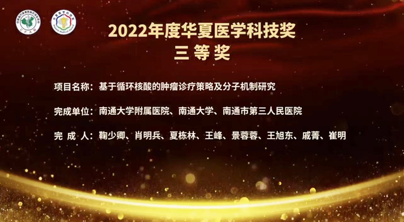 12月15日下午,2022年度华夏医学科技奖颁奖大会在北京举行,附属医院鞠少卿教授团队项目《基于循环核酸的肿瘤诊疗策略及分子机制研究》荣获2022年华夏医学科学技术奖三等奖。这是附属医院首次以第一完成单位获得该奖项。