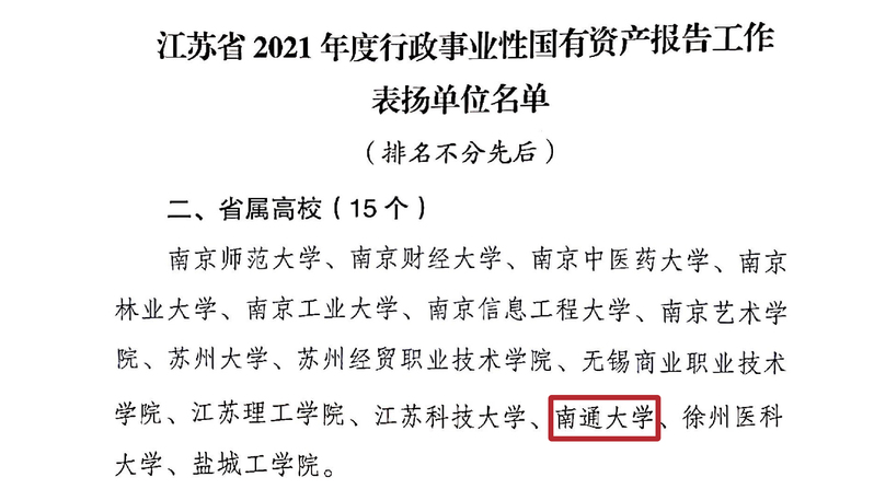 近日,江苏省财政厅通报全省2021年度行政事业性国有资产报告工作情况,对成绩突出的省级部门、省属高校、市县财政部门予以表扬,我校为15所受表扬省属高校之一。