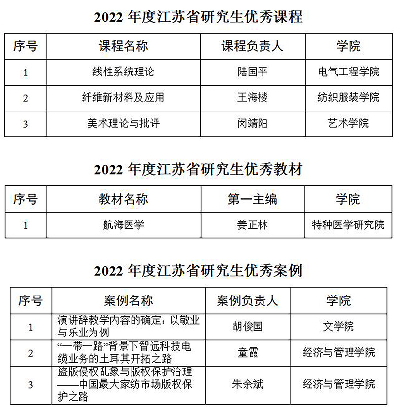 近日,省教育厅公布2022年度江苏省研究生优质教学资源评选结果,我校推荐的项目获评江苏省研究生优秀课程3门,江苏省研究生优秀教材1本,江苏省研究生优秀教学案例3个。