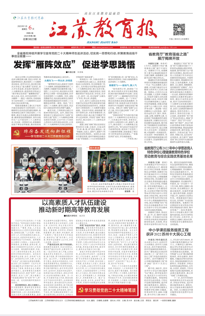 1月6日出版的《江苏教育报》头版刊发我校校长施卫东题为《以高素质人才队伍建设推动新时期高等教育发展》的署名文章。