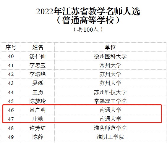 近日,江苏省教育厅公布2022年江苏省教学名师人选,我校吕广明、庄勋两位教师获评“江苏省教学名师”。
