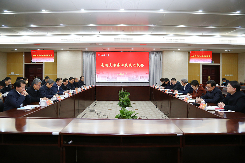 在随后召开的南通大学事业发展汇报会上,吴新明认真观看了我校校情片《薪火》,充分肯定了我校发展取得的成绩,并介绍了南通经济社会发展状况和面临的重大战略机遇。他表示,南通大学自1912年创办至今百十年,几经变迁,从无到有、从小到大,不断进步、不断发展,建设了一批优势学科、培养了一批优秀人才,是一所历史悠久、成绩斐然的地方综合性大学。当前南通市正处于长三角一体化战略、长江经济带发展战略、江苏省委省政府“1+3”重点功能区战略、区域协同发展战略等重大战略机遇交汇叠加的历史时期,这既是南通发展的重要机遇,也是南通大学发展的重要机遇。他指出,南通因张謇而闻名,南通大学因张謇而设立。在新一轮发展进程中,要大力推动名城、名校融合发展。作为南通最重要的高等教育学府,南通大学一要提升创新能力,顺应社会发展,推动学科建设取得新提升;二要解放思想、开拓思路,努力打造一批重点学科,在高水平大学建设中取得新进展;三要学习兄弟高校经验,建立完善的“名城名校融合发展”战略和机制,努力把南通大学办成不仅是南通的名校,乃至江苏的知名高校;四要落实立德树人根本任务,高度重视意识形态工作,把南通大学真正建设成为高端人才成长、培养的摇篮和基地,成为一个积极向上的重要平台和载体。