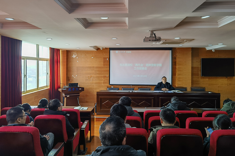 张志刚传达了校党委书记尚庆飞所作的题为《共担新使命 同塑新辉煌》的讲话精神和校长施卫东所作的题为《凝心聚力 勇毅前行 为建成特色鲜明的高水平大学不懈奋斗》的学校工作报告,回顾总结了2022年学院各项工作所取得的成绩和存在的不足,并对学院2023年工作计划进行部署。他希望全院教职工在校“两代会”精神指引下,一要加强理论学习,以习近平新时代中国特色社会主义思想为指导,深入学习贯彻落实党的二十大精神,守正创新,笃行不怠,扎实推进党建与业务齐头并进,相融互促。二要坚持立德树人根本任务,坚守为党育人、为国育才初心使命,推进“三全育人”,在工作中做到守土有责、守土尽责,发扬敬业奉献精神,服务学生成长成才。三要认真贯彻落实校“两代会”精神,围绕全年目标任务,查漏补缺,细化工作安排,发扬斗争精神,加强内涵建设,努力为学院和学校高质量发展作出贡献。