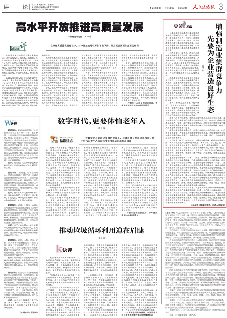 3月2日出版的《人民政协报》刊发全国政协委员、我校校长施卫东题为《增强制造业集群竞争力 先要为企业营造良好生态》的署名文章。