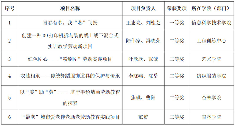 近日,由江苏省高等教育学会组织的高等学校劳动教育优秀实践项目评选结果揭晓,我校获一等奖1项,二等奖5项。其中,由信息科学技术学院王志亮、刘桂芝作为项目负责人的《青春有梦,我“芯”飞扬》获得一等奖。