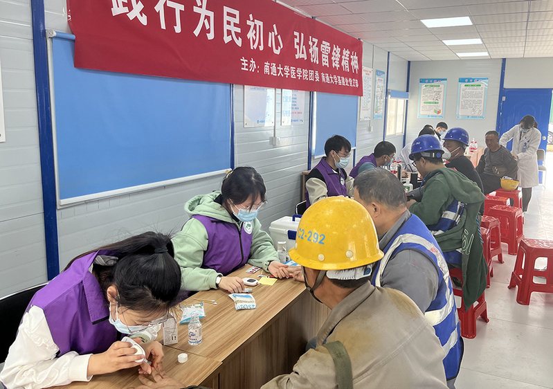 另一边,“爱立方”团队还为中建二局南通大学项目部的农民工人开展了一场“特别的”义诊活动。以“阳康”为创新点,重点关注工作量极大的工人健康情况。“因为我们还是本科生,能做的还比较局限,但是我们想给工友们最全面和最权威的检查。”医学院临床203班刘一航面对义诊过程中测量出的不正常数据,立马向现场的研究生寻求帮助,详细地询问过往病史、耐心地提供就医指导……在那个挤满了200多人的简陋小教室里,刘一航等人就如同一颗“定心丸”,稳稳地安抚着各位工人的心。