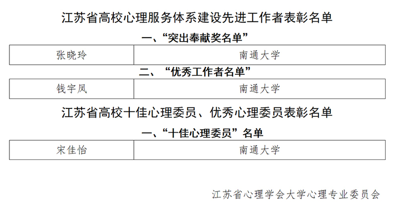 我校师生获江苏省大学生心理专业委员会表彰。