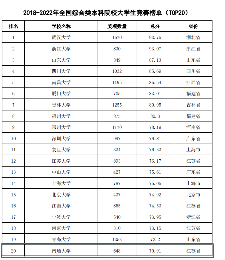 全国综合类本科院校大学生竞赛榜单(本科)”位列20名。