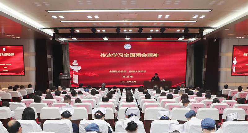 3月30日下午,附属医院召开传达学习2023年全国两会精神报告会。全国政协委员、南通大学校长施卫东,全国人大代表、附属医院骨科临床研究中心主任刘璠分别作专题辅导报告。