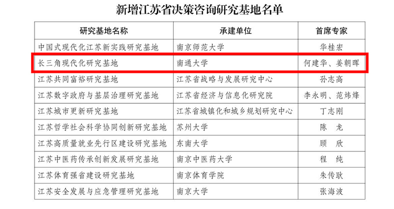 4月7日,江苏省哲学社会科学界联合会公布了新增江苏省决策咨询研究基地名单,我校长三角现代化研究基地成功入选。