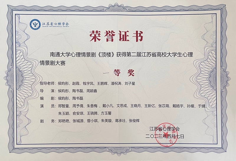 4月7日,“青春阳光・温暖携行”江苏省第二届高校心理情景剧大赛在东南大学举办。我校选送的作品《顶楼》获优秀作品一等奖,公共卫生学院医检211班学生戴小凡获最佳女主角奖。