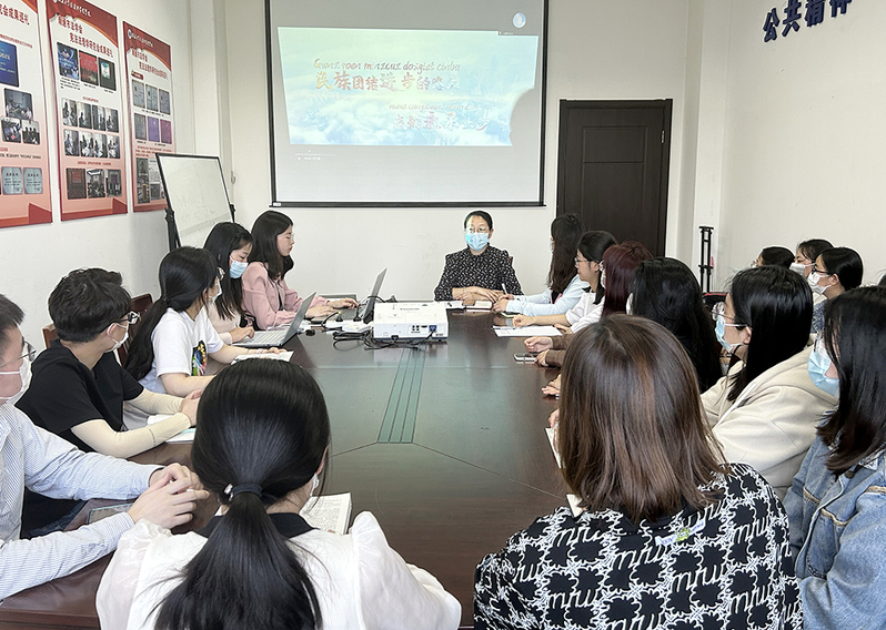 研究生党支部书记陈丽带领大家学习了习近平总书记关于民族团结进步的系列重要讲话和重要论述。她强调,我国是一个统一的多民族国家,只有铸牢中华民族共同体意识,构建起维护国家统一和民族团结的坚固思想长城,各民族共同维护好国家安全和社会稳定,才能实现好、维护好、发展好各民族根本利益。