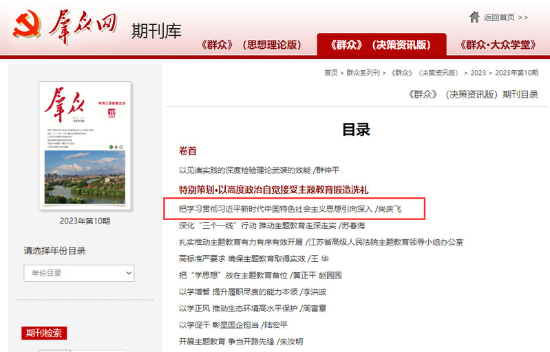 5月下旬出版的《群众》杂志决策咨询版在“特别策划·以高度政治自觉接受主题教育锻造洗礼”栏目刊发了我校党委书记尚庆飞题为《把学习贯彻习近平新时代中国特色社会主义思想引向深入》的理论文章。