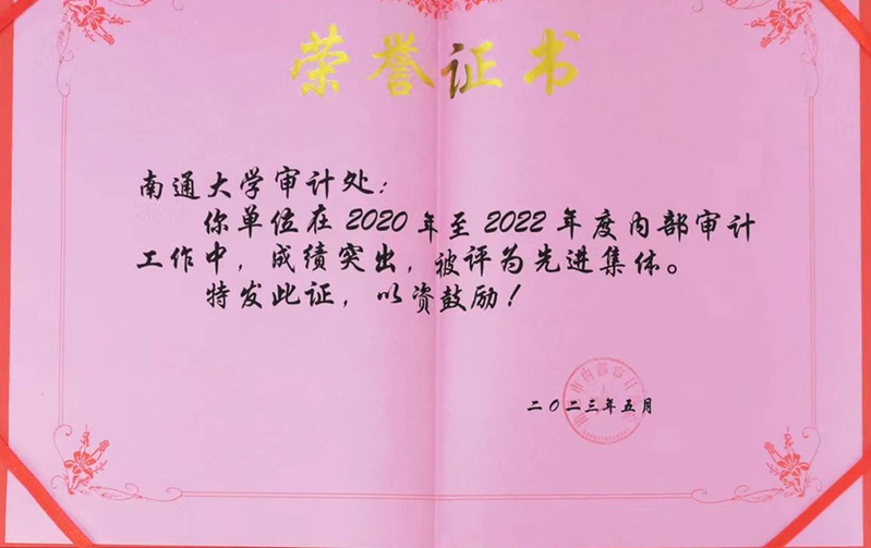 近日,南通市内部审计协会表彰了2020-2022年全市内部审计工作先进集体和先进个人。我校审计处获评南通市内部审计工作先进集体,彭怡秋同志获评南通市内部审计工作先进个人。