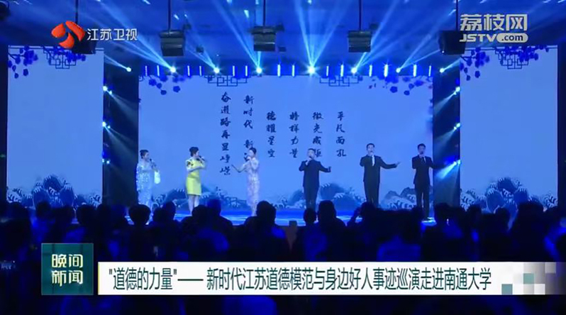5月30日,江苏卫视晚间新闻栏目以《“道德的力量”——新时代江苏道德模范与身边好人事迹巡演走进南通大学》为题,关注此次巡演在我校举办。