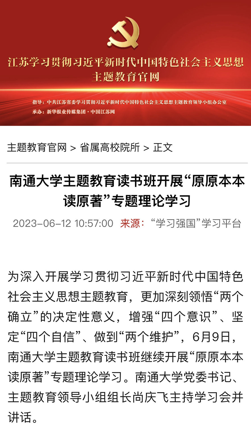 6月12日,江苏学习贯彻习近平新时代中国特色社会主义思想主题教育官网报道我校主题教育读书班开展“原原本本读原著”专题理论学习。