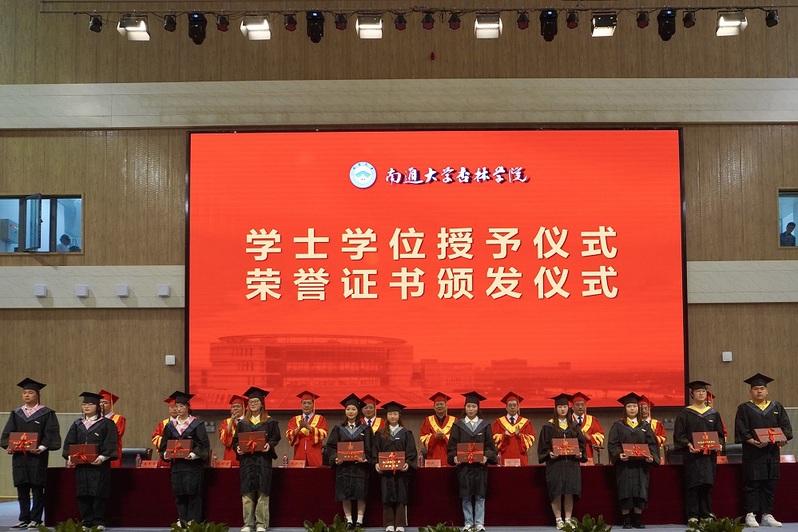 启东校区典礼上与会领导为毕业生代表颁发证书。