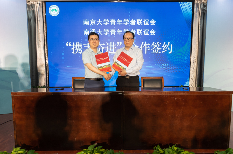 南京大学青年学者联谊会会长、社会科学处处长陈冬华,南通大学青年学者联谊会首届会长钱涛代表两校青联会共同签署“携手奋进”战略合作协议。