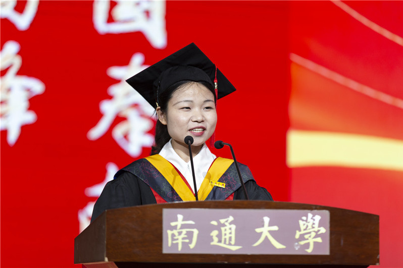 信息科学技术学院博士研究生谷晓会作为毕业生代表发言,深情回顾了在通大本硕博就读十年的奋斗时光。她表示,通大已经融入了她的血脉。她选择留在通大任教,为塑造在全省、全国更有作为、更有影响、更有地位的“新通大”而拼搏奋斗。