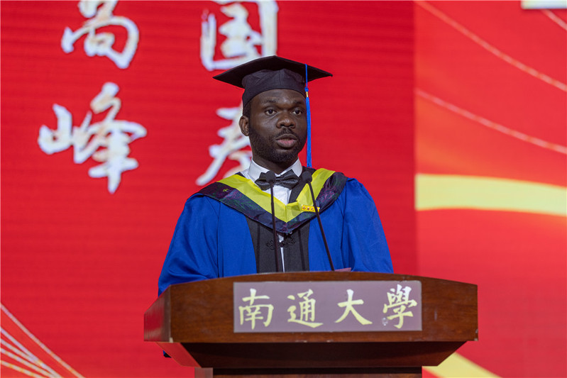来自贝宁的交通与土木工程学院硕士研究生艾瑞克作为国际学生代表发言,表示在通大的三年时光让他学有所成,让他终生难忘。他将用亲身经历向贝宁人民讲好中国故事,希望中非年轻人携手共建更加紧密的中非命运共同体。