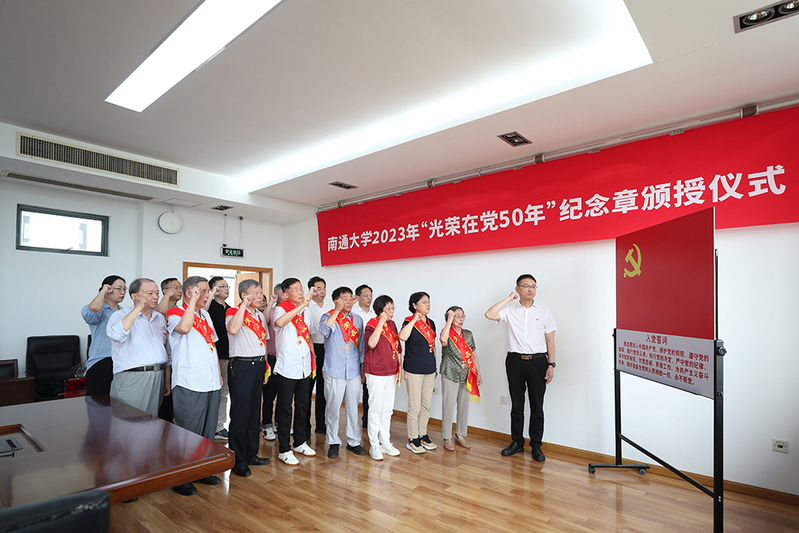 仪式中,吉明明为2023年“光荣在党50年”纪念章获得者代表颁授纪念章和政治生日贺卡;吴如高宣读了南通大学2023年“光荣在党50年”纪念章获得者名单;离退休党工委书记邵春明带领与会全体党员重温入党誓词。