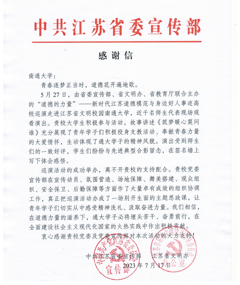 7月17日,江苏省委宣传部、江苏省文明办向我校发来感谢信,肯定我校主动担当作为,为“道德的力量”——新时代江苏道德模范与身边好人事迹高校巡演走进南通大学专场活动作出积极贡献。