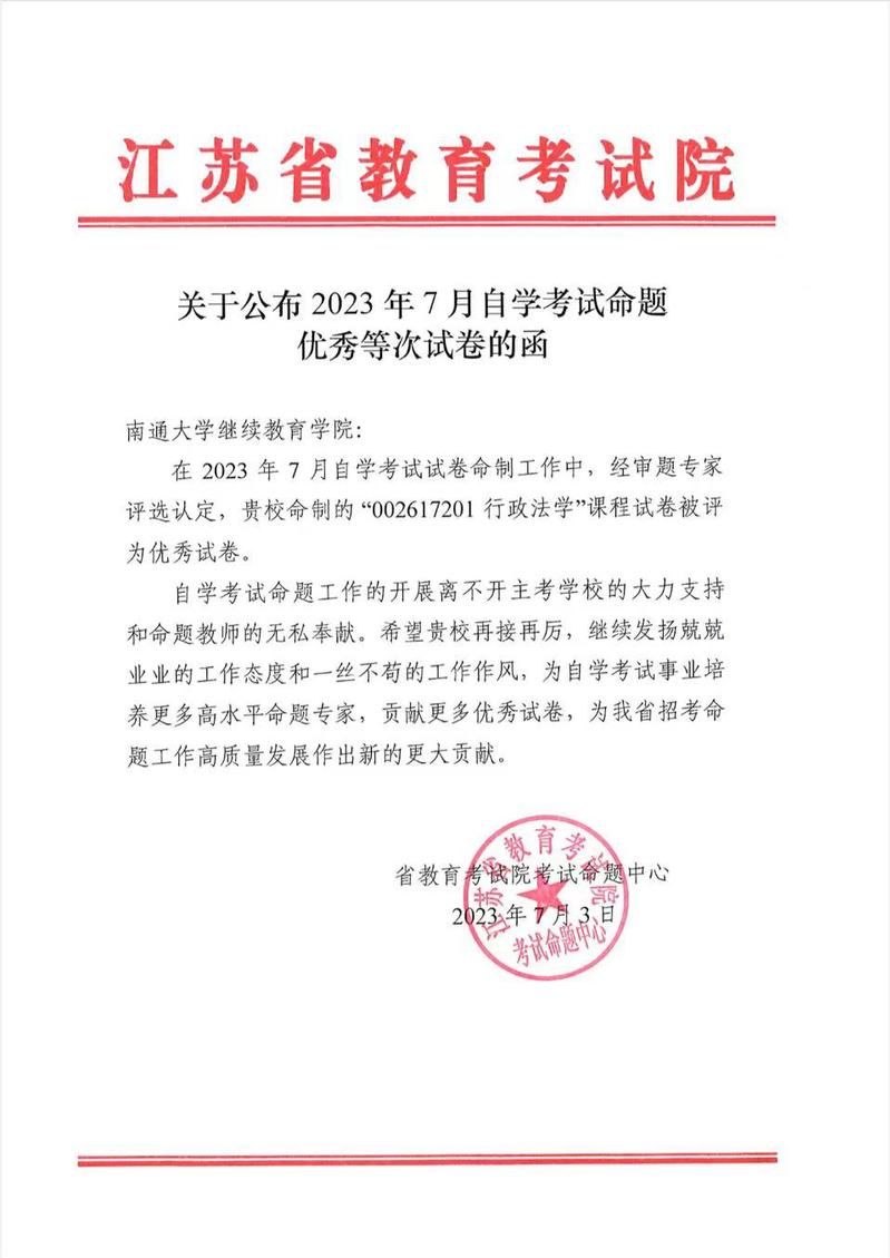 近日,江苏省教育考试院组织审题专家对自考助学考试委托主考学校命制试卷进行评审,我校受委托命制的“002617201行政法学”课程试卷被评为优秀等次试卷。