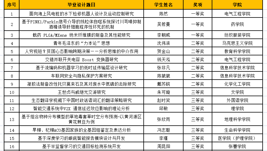 近日,省教育厅公布2022年江苏省普通高校本科优秀毕业设计(论文)评选结果。我校获省优秀毕业设计(论文)单篇一等奖3项、二等奖6项、三等奖13项,获省优秀团队毕业设计(论文)3项,获奖数量和质量再创新高。我校共报送28篇毕业设计(论文)参评,获奖比例达到89.29%。