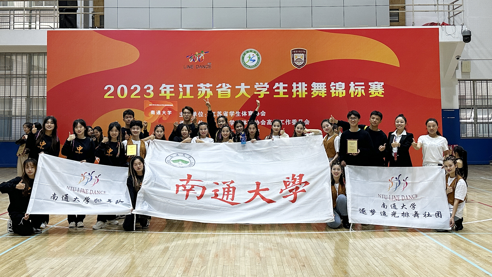 本次比赛由江苏省学生体育协会主办,来自江南大学、南京邮电大学、南京林业大学、江苏科技大学、南京铁道职业技术学院等30所本科和高职院校的近600名运动员参加本次比赛。体育科学学院教师沈金花和陆丹华率领我校22名运动员参加专业院校组的比赛,通大健儿在比赛中发挥团队合作精神,不畏强敌,最终获得专业院校组串烧曲目、自选曲目、规定曲目三个项目的第一名以及团体总分第一名共4项冠军。