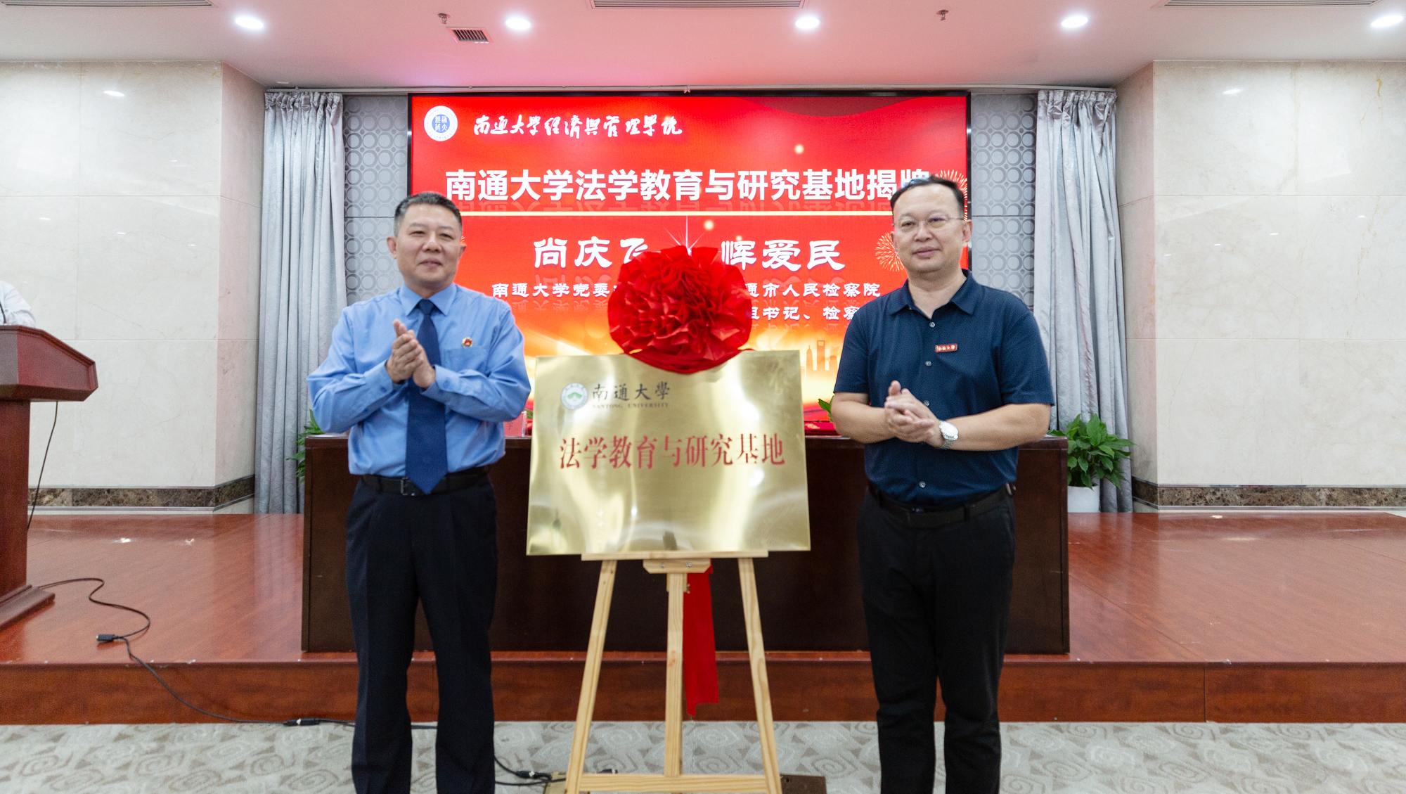 11月3日下午,我校与南通市人民检察院举办检校合作协议签约仪式,并为共建的“法学教育与研究基地”揭牌。校党委书记尚庆飞,南通市检察院党组书记、检察长恽爱民出席活动并致辞。校党委常委、副校长陆俊杰出席仪式。