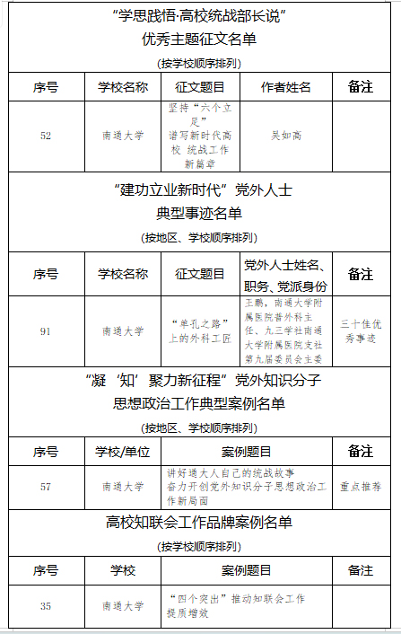 其中,我校上报的主题征文《坚持“六个立足” 谱写新时代高校统战工作新篇章》获“学思践悟·高校统战部长说”优秀主题征文称号;推报的党外人士事迹《“单孔之路”上的外科工匠》获“建功立业新时代”党外人士典型事迹称号,并入选“三十佳优秀事迹”;上报的党外知识分子思想政治工作案例《讲好通大人自己的统战故事 奋力开创党外知识分子思想政治工作新局面》获“凝‘知’聚力新征程”党外知识分子思想政治工作典型案例称号,并荣获重点推荐;上报的高校知联会工作案例《“四个突出”推动知联会工作提质增效》获高校知联会工作品牌案例称号。