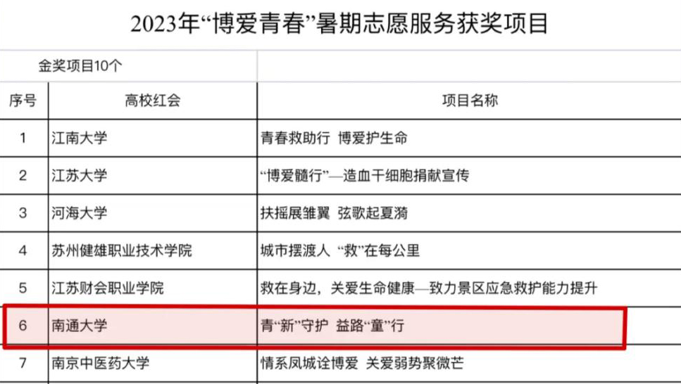 近日,2023年全省高校红十字会“博爱青春”暑期志愿服务项目总结展示活动在河海大学举行。经过项目评审,我校商学院(管理学院)“‘青‘新’守护 ‘益’路‘童’行”项目被评为金奖项目,这是我校第11次获得该项荣誉。