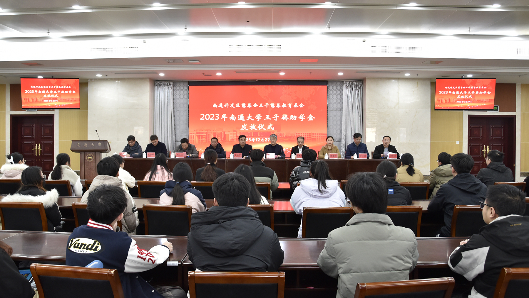 南通开发区慈善会、江苏王子制纸有限公司代表,学生工作部、社会资源处相关负责人,全体受奖助学生参加发放仪式。