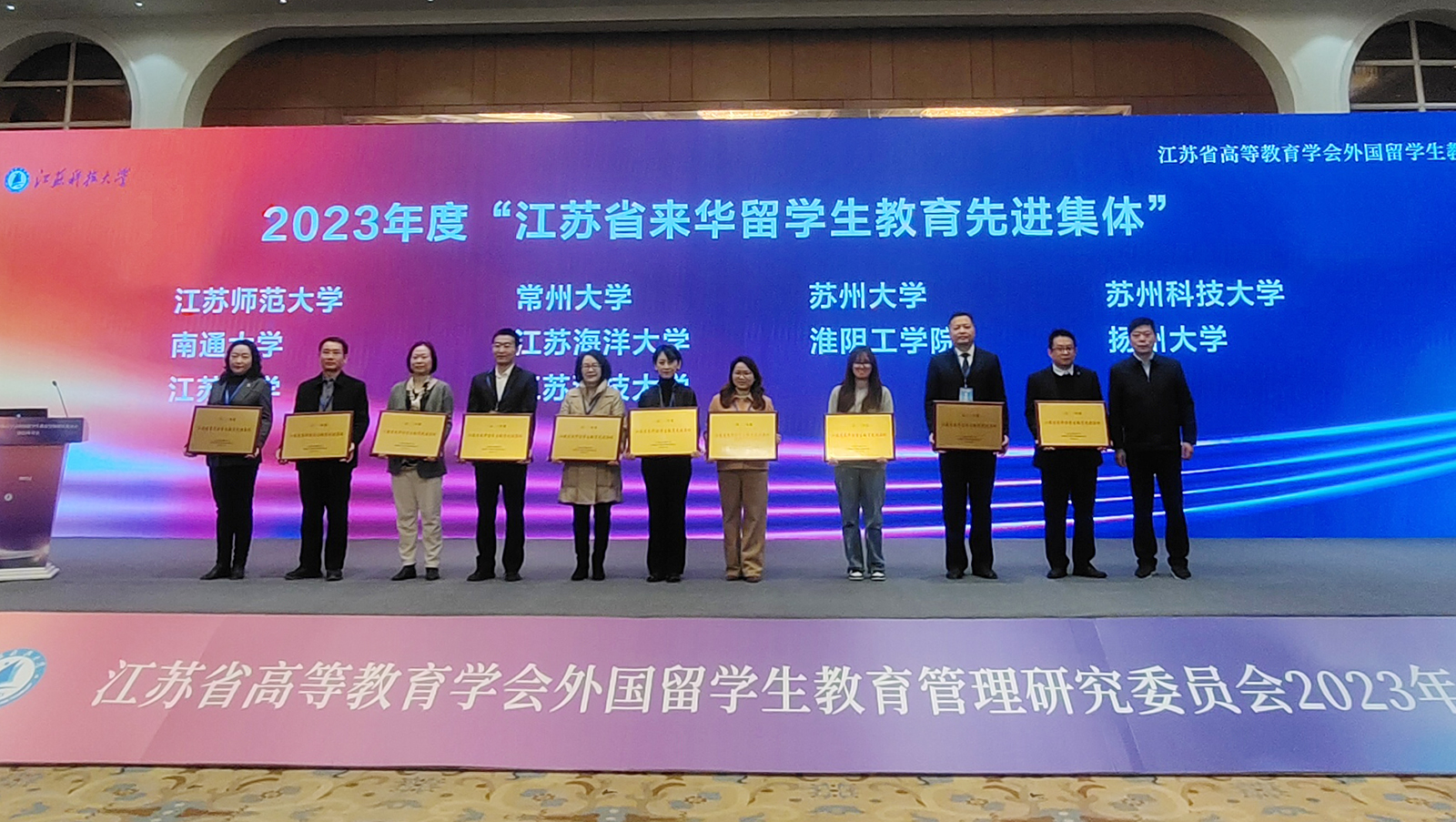12月29日,江苏省高等教育学会外国留学生教育管理研究委员会2023年年会在镇江召开。会议对相关先进集体和个人进行了表彰,我校荣获2023年度“江苏省来华留学生教育先进集体”称号,国际教育学院王璐璐、蒋濛获评“江苏省外国留学生教育管理先进个人”,陈君君获评“江苏省优秀留学生辅导员”。