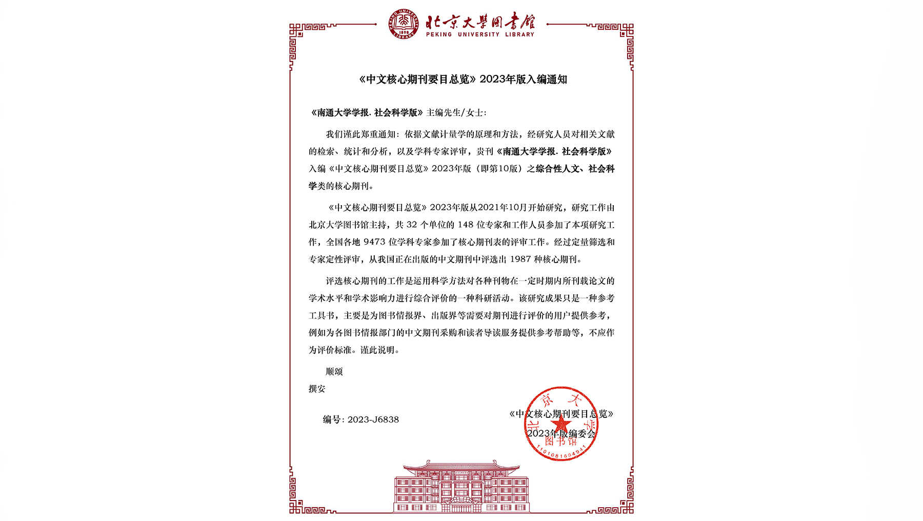 近日,北京大学图书馆《中文核心期刊要目总览》2023年版编委会向我校发来通知,《南通大学学报(社会科学版)》入编《中文核心期刊要目总览》2023年版(即第10版)的综合性人文、社会科学类核心期刊。