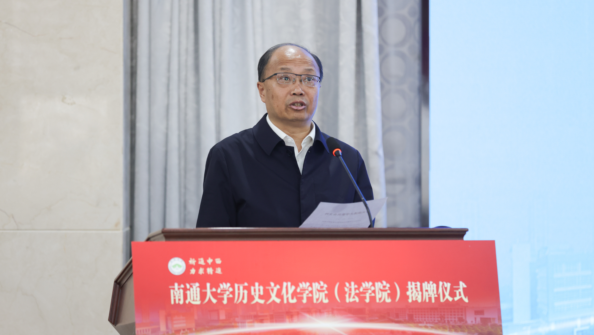 高源代表江苏省法学会向我校历史文化学院(法学院)正式揭牌表示祝贺。他表示,南通大学历史文化学院(法学院)的成立,是南通法学教育取得的重大突破,是南通法治建设的又一重大发展,是学习贯彻党的二十大精神推动江苏法学教育高质量发展的又一重大成果,更是推进法治江苏建设的生动实践。他对南通大学历史文化学院(法学院)提出三点期望:一是思想同心,坚持正确的政治方向;二是目标同向,提高法治人才培养质量;三是教研同步,推动法学教育创新发展。