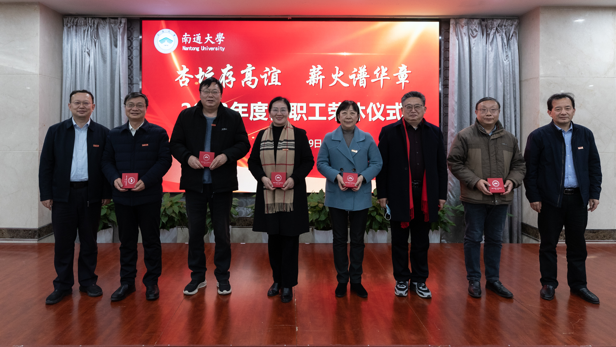 仪式现场简约隆重、暖意融融。尚庆飞、王卫东共同为退休教职工颁发荣休纪念章。