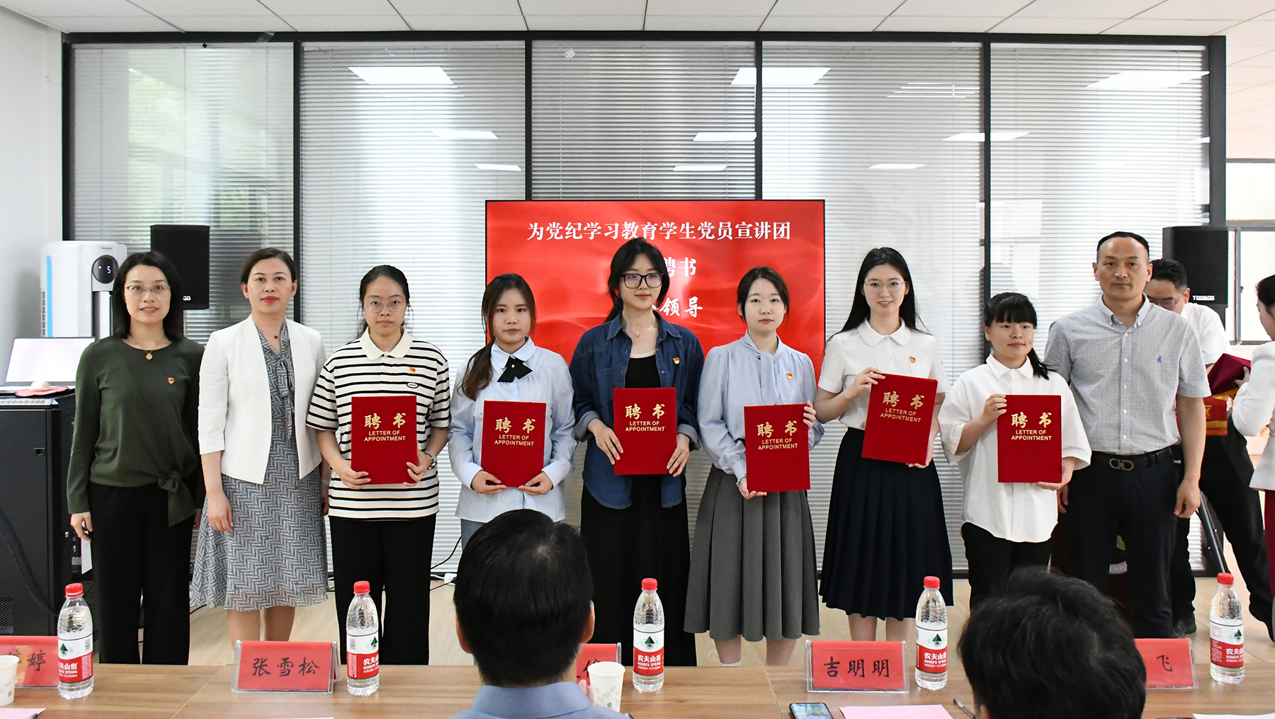 与会领导共同为李园“一站式”学生社区党纪学习教育学生党员宣讲团成员颁发聘书。